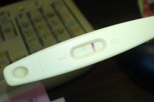 第四次門診,在門診前幾天,親愛的老婆就感覺下腹部悶悶的,應該這個月又失敗了。在門診時,經由腹部超音波觀察子宮壁厚度夠厚,是有利於著床的環境,但是老婆提出感覺上似乎MC要來的質疑,於是醫生便說直接驗尿看看結果。平時老婆看門診前就有先上廁所的習慣(因為要照超音波),這時要擠出尿來有點困難,勉強尿出一點點,天真的老婆覺得似乎太少,就先倒掉再等下一泡,好不容易才完成驗孕棒的檢驗,回到門診。